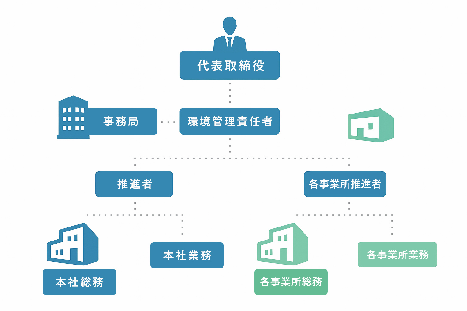 推進者の役割 | 経営管理システムの運用、環境管理責任者への報告 |
